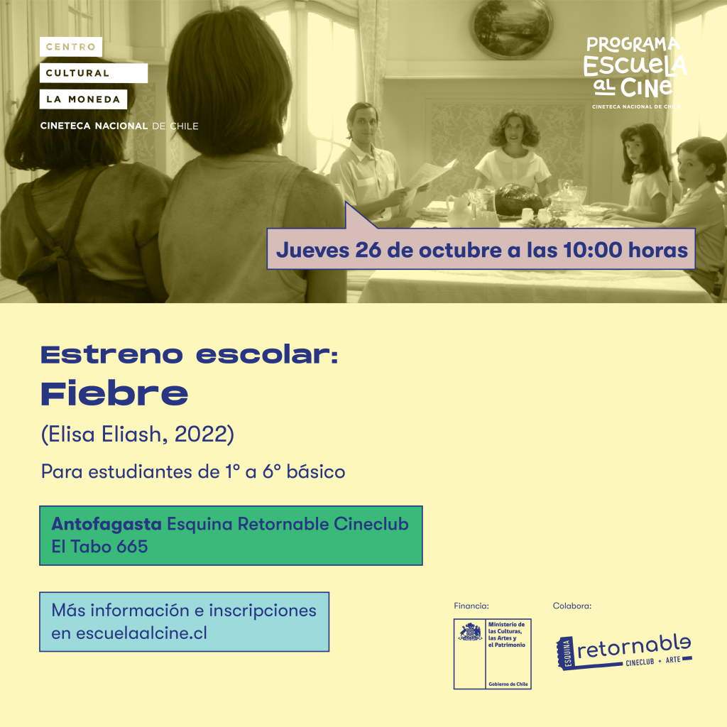 ANTOFAGASTA: ESTRENO ESCOLAR DE OCTUBRE+ Añadir Google Calendar+ exportación iCal / Outlook Fecha26 Oct 2023¡Caducado! Hora 10:00 am - 12:00 pm Más InformaciónInscripciones LocalizaciónAntofagasta - Retornable CineclubMuseo Ruinas de Huanchaca Categoría Estrenos Organizador Programa Escuela al Cine Correo electrónico comunicaciones.escuelaalcine@gmail.com Web https://escuelaalcine.gob.cl/ InscripcionesCompartir este evento