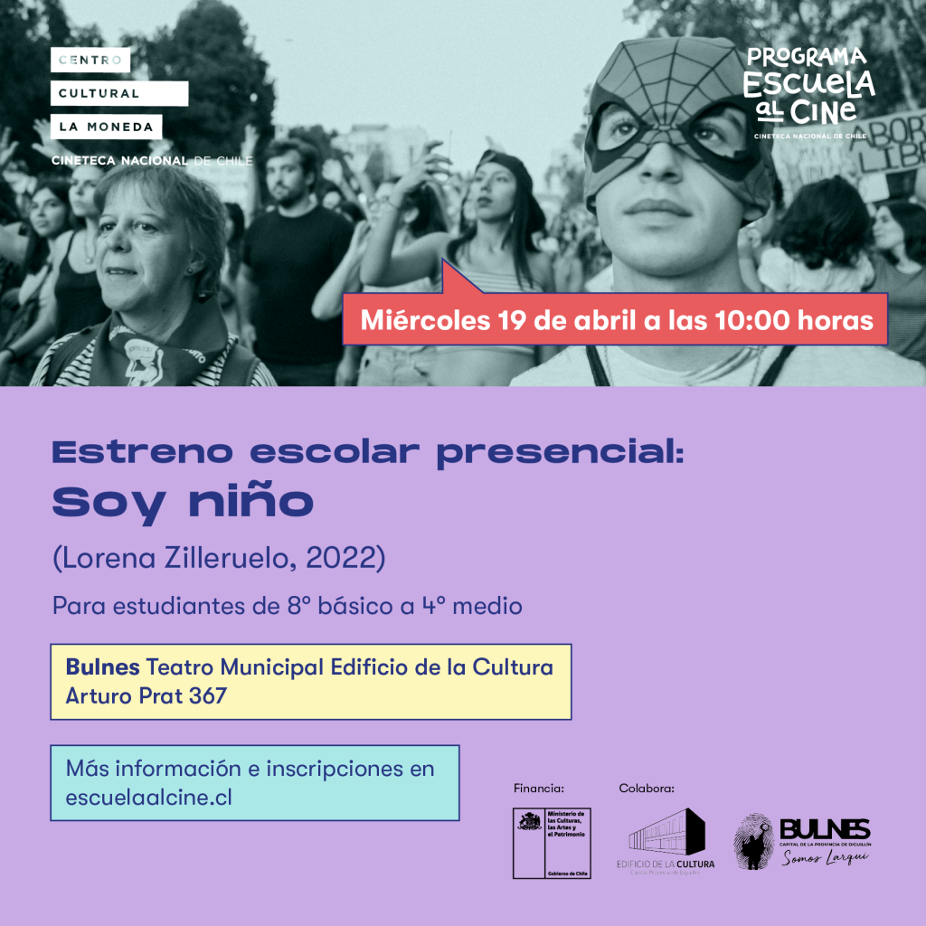 Bulnes: estreno escolar de abril+ Añadir Google Calendar+ exportación iCal / Outlook Fecha19 Abr 2023¡Caducado! Hora 10:00 am - 11:30 am Más InformaciónInscripciones LocalizaciónTeatro Municipal Edificio de la CulturaArturo Prat 367 Categoría Estrenos Organizador Programa Escuela al Cine Correo electrónico comunicaciones.escuelaalcine@gmail.com Web https://escuelaalcine.gob.cl/ InscripcionesCompartir este evento