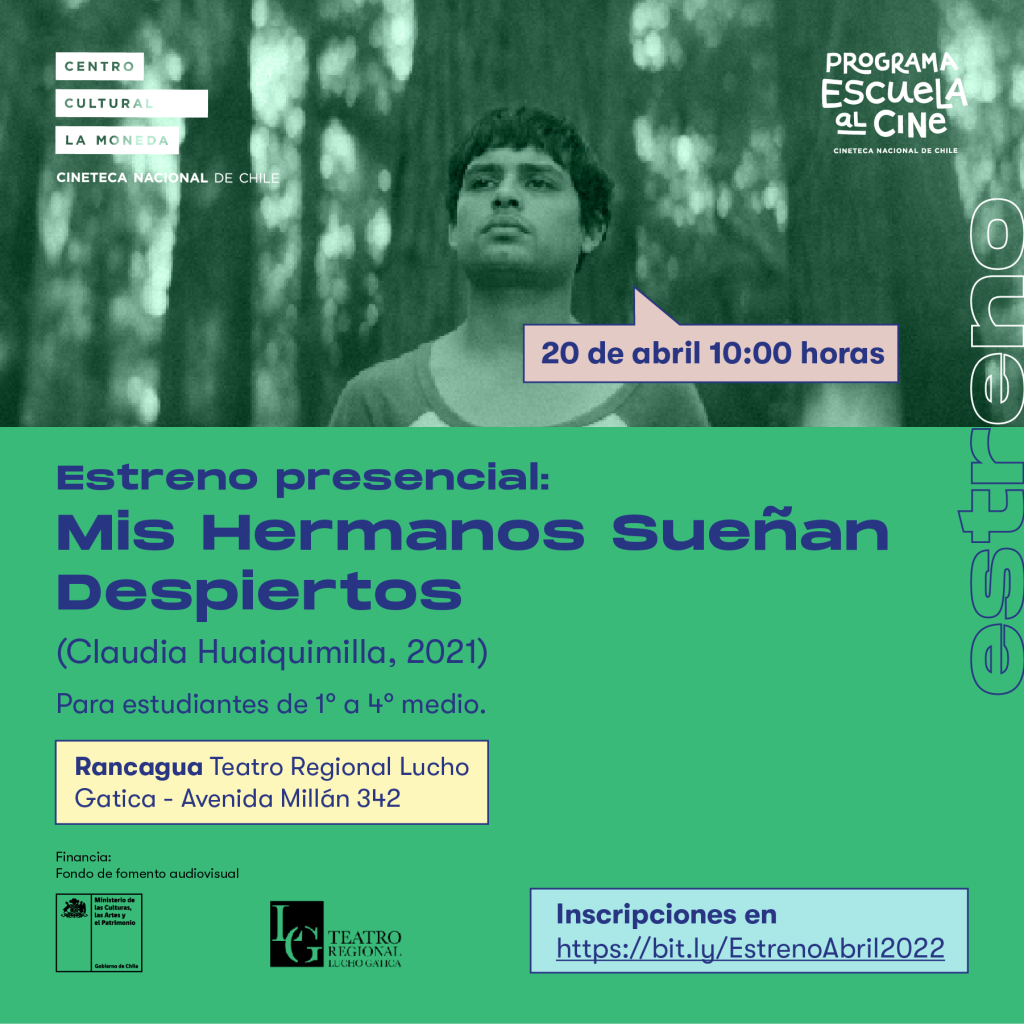 Rancagua: Estreno escolar de abril+ Añadir Google Calendar+ exportación iCal / Outlook Fecha20 Abr 2022¡Caducado! Hora 10:00 am - 12:30 pm Más InformaciónInscripciones LocalizaciónTeatro Regional Lucho GaticaAvenida Millán 342, Rancagua Categoría Estrenos Organizador Programa Escuela al Cine Correo electrónico comunicaciones.escuelaalcine@gmail.com Web https://escuelaalcine.gob.cl/ InscripcionesCompartir este evento
