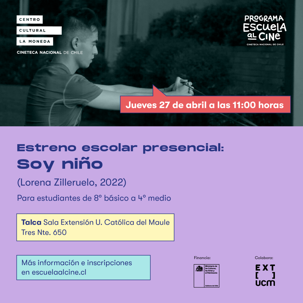 Talca: estreno escolar de abril+ Añadir Google Calendar+ exportación iCal / Outlook Fecha27 Abr 2023¡Caducado! Hora 11:00 am - 12:30 pm Más InformaciónInscripciones LocalizaciónExtensión Universidad Católica del Maule3 norte 650, Talca Categoría Estrenos Organizador Programa Escuela al Cine Correo electrónico comunicaciones.escuelaalcine@gmail.com Web https://escuelaalcine.gob.cl/ InscripcionesCompartir este evento