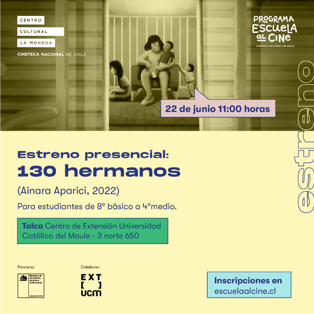 Talca: estreno escolar de junio+ Añadir Google Calendar+ exportación iCal / Outlook Fecha22 Jun 2022¡Caducado! Hora 11:00 am - 1:00 pm Más InformaciónInscripciones LocalizaciónExtensión Universidad Católica del Maule3 norte 650, Talca Categoría Estrenos Organizador Programa Escuela al Cine Correo electrónico comunicaciones.escuelaalcine@gmail.com Web https://escuelaalcine.gob.cl/ InscripcionesCompartir este evento