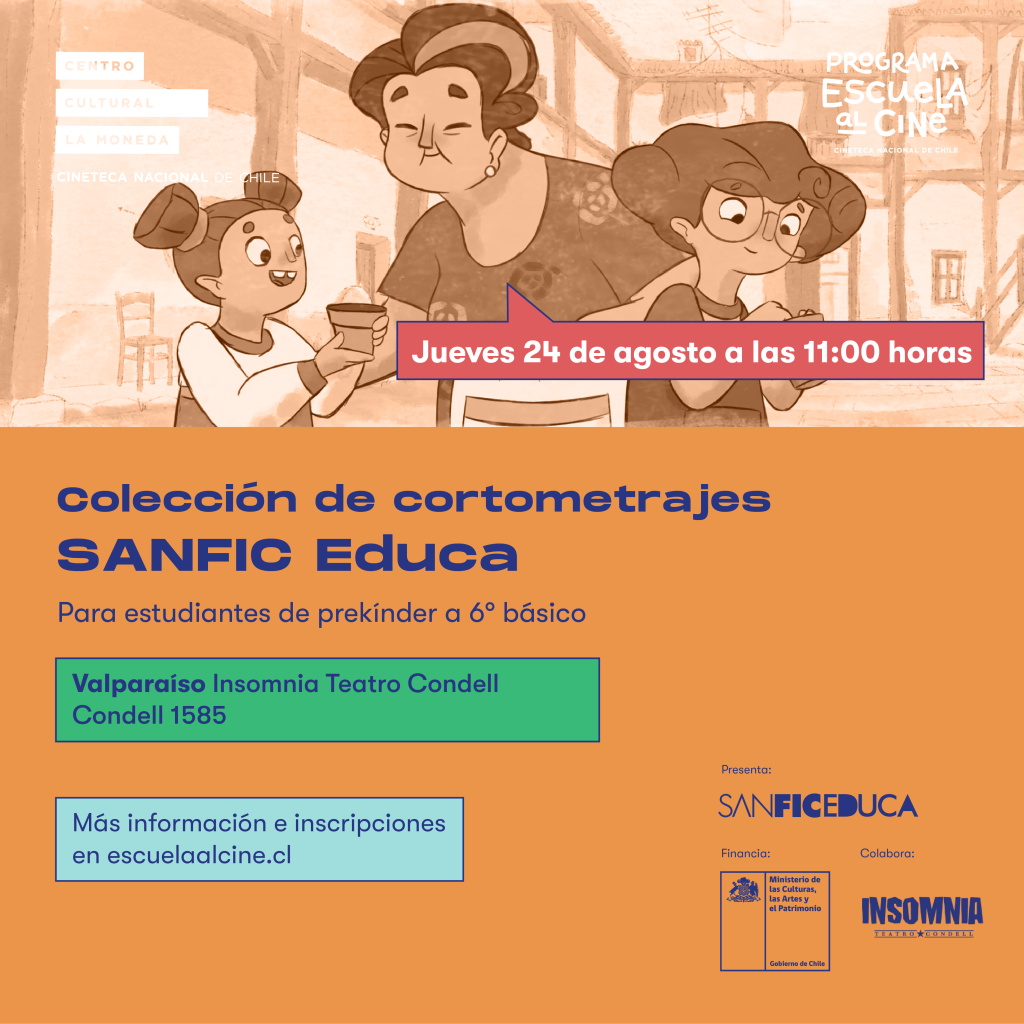VALPARAÍSO: ESTRENO ESCOLAR DE AGOSTO+ Añadir Google Calendar+ exportación iCal / Outlook Fecha24 Ago 2023¡Caducado! Hora 11:00 am - 11:45 am Más InformaciónInscripciones LocalizaciónInsomnia Teatro CondellCondell 1585, Valparaíso Categoría Estrenos Organizador Programa Escuela al Cine Correo electrónico comunicaciones.escuelaalcine@gmail.com Web https://escuelaalcine.gob.cl/ InscripcionesCompartir este evento