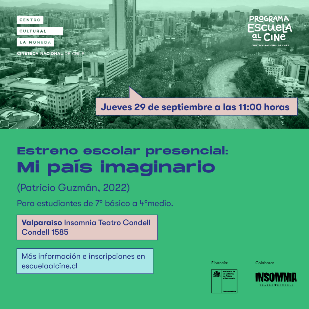 VALPARAÍSO: ESTRENO ESCOLAR DE SEPTIEMBRE+ Añadir Google Calendar+ exportación iCal / Outlook Fecha29 Sep 2022¡Caducado! Hora 11:00 am - 1:00 pm Más InformaciónInscripciones LocalizaciónInsomnia Teatro CondellCondell 1585, Valparaíso Categoría Estrenos Organizador Programa Escuela al Cine Correo electrónico comunicaciones.escuelaalcine@gmail.com Web https://escuelaalcine.gob.cl/ InscripcionesCompartir este evento